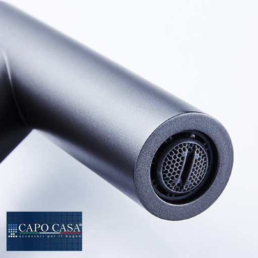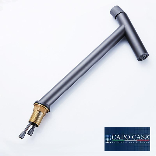 Mrežasta narebrena ručka slavine. Smer okretanja i aerator su drugačiji. Ovaj aerator je više umetnički.