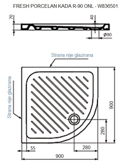 - Ugaona tuš kada otvor za sifon Ø 90 mm (odvojeno od zida)